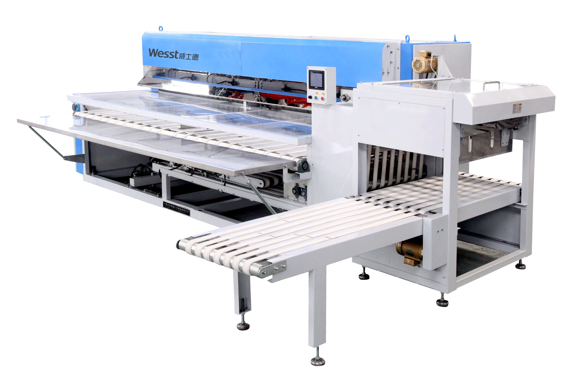 3、 橫向折疊配置最多四通道折疊工作模式,布草不必同步輸入,不必同樣大小,工作效率提高四倍